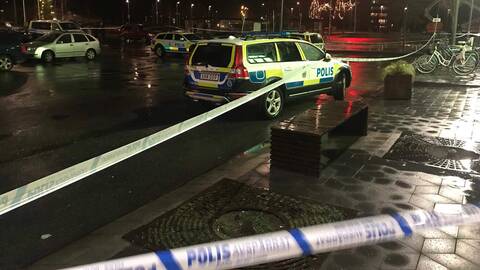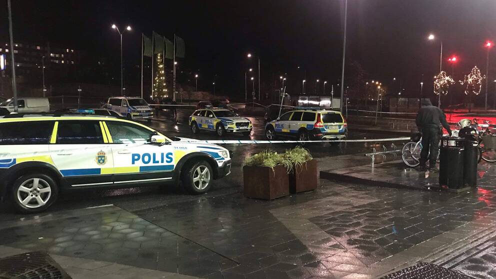 Polisen upprättade avspärrningar vid parkeringen framför ingången till hjällbo centrum.